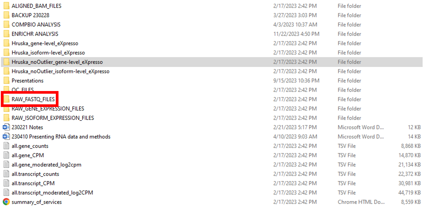 After the sequencing run, GTAC provided a standard analysis package to Dr. Hruska’s group as displayed in Figure 1. One question that comes to us often is around which files should be submitted from the package from GTAC. The short answer is that GEO formally requires two data types for submission – raw FASTQ files and processed data files containing raw and/or normalized counts (FPKM, TPM, etc.) of sequencing reads for genes and/or transcripts.