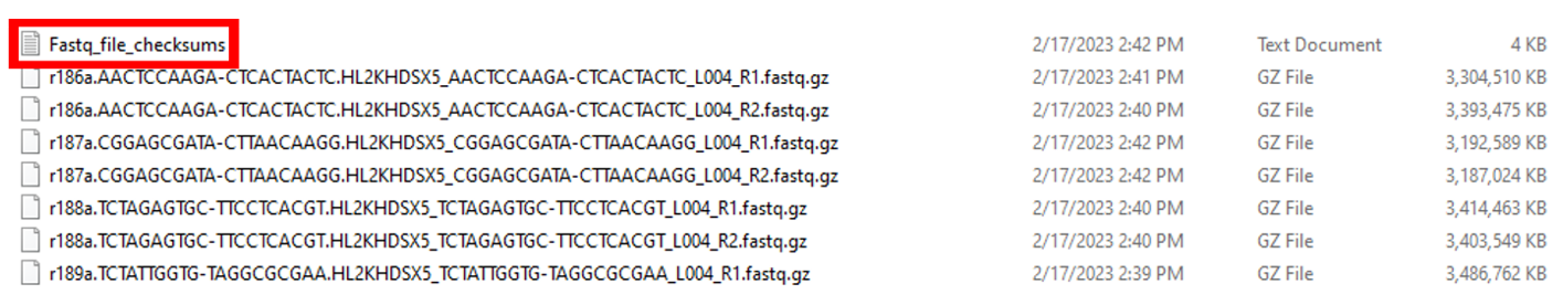 In our example, the raw FASTQ files (in the compressed fastq.gz format) are located in the RAW_FASTQ_FILES folder. The top portion of the RAW_FASTQ_FILES folder is shown in Figure 2. The first item in the folder is an MD5 checksum file. A checksum is a small-sized block of data derived from another block of digital data for the purpose of detecting errors that may have been introduced during its transmission or storage. This file is very useful as GEO strongly recommends that submitters provide MD5 checksums for raw data files. Since paired-end sequencing was used for this project, each sample has two FASTQ files – R1 for the forward read and R2 for the reverse read. The sample name is at the beginning of the file name, followed by the Illumina Library Index associated with each sequencing run.