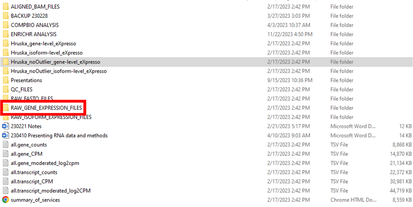 The processed data is located in a folder named RAW_GENE_EXPRESSION_FILES in the top-level folder, which contains individual-level reports (Figure 3).