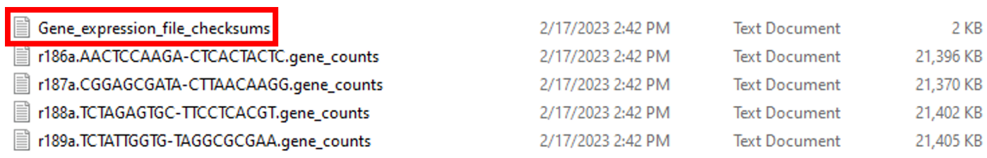 The RAW_GENE_EXPRESSION_FILES folder contains an MD5 checksum file at the top (Figure 4). Although GEO does not specifically mention checksums for processed files, many researchers choose to submit them along with checksums for raw data files. The gene counts of each sample are reported in separate text files. The names of the gene counts files follow the same format as the raw FASTQ files.