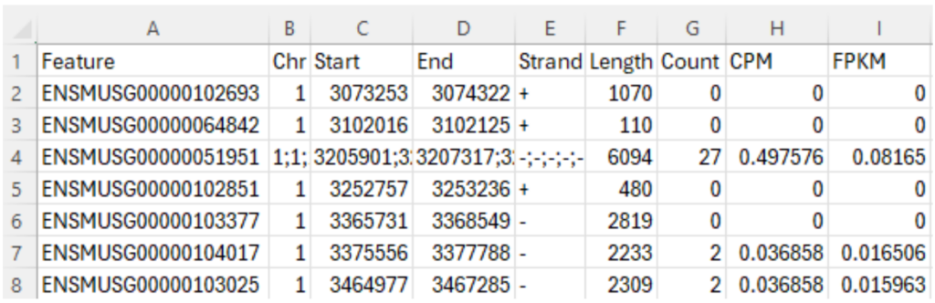 Let’s download the “gene counts” file for Sample GSM8080474 through this link from GEO, which is the second file in Figure 4. This “gene counts” file contains 9 columns, as shown in Figure 5. The first column, “Feature”, is the Ensembl stable ID for each gene. Stable IDs are created in the form ENS[species prefix][feature type prefix][a unique eleven-digit number]. For example, ENSMUSG is the prefix of a mouse gene, where MUS is the species prefix for “mouse”, and G is the feature type prefix for “gene”. The next five columns provide genomic coordination information of a gene: chromosome number, start and end base position, strand orientation, and full transcript length. The last three columns provide gene expression data: raw counts, counts per million (CPM) and Fragments Per Kilobase Million (FPKM). This blog article is a good read to understand these numbers. The total number of gene features reported in this file is 55,487.