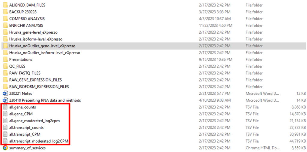 So far, we have described two data types that can be used for GEO submission. However, there is an alternative set of processed data files that can be submitted to GEO along with the raw FASTQ files. Going back to the top-level folder, there are six TSV files in the top-level folder (“all.gene_counts”, “all.gene_CPM”, “all.gene_moderated_log2cpm”, “all.transcript_counts”, “all.transcript_CPM”, “all.transcript_moderated_log2CPM’) (Figure 6). These processed data files contain expression data at the whole study level, instead of the individual sample level.