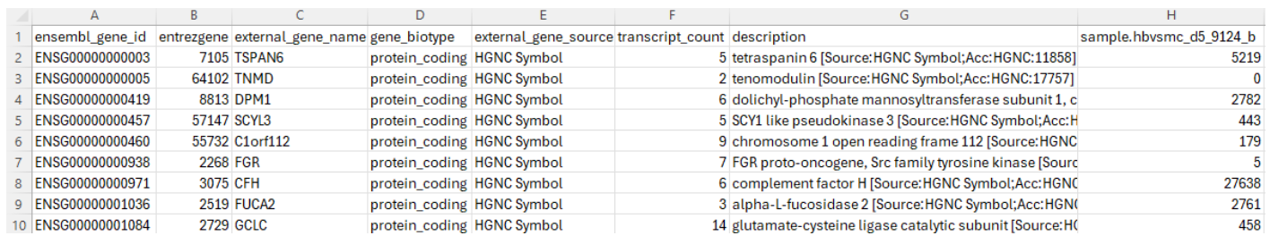 Some researchers prefer to submit study-level processed data files instead of sample-level processed data files. In our example, Dr. Hruska’s team decided to submit sample-level processed data files. In order to demonstrate the content of study-level processed data files, we are going to look at another dataset GSE283004. In this dataset, there is one study-level processed file titled “GSE283004_Fig_2-3_Somatic_RNA-seq_all.gene_counts.tsv.gz”, which can be downloaded through this link. This file contains gene expression counts for 55,209 genes across 20 biological samples (Figure 7). The first three columns correspond to the “Ensembl stable ID” for a gene, “Entrez Gene ID” for a gene (more information in this reference) and the gene name mostly from the HUGO Gene Nomenclature Committee (HGNC). The fourth column specifies gene types. The most common type is “protein coding”. Other types include “rRNA”, “SnoRNA”, “SnRNA”, “miRNA”, “lincRNA”, “scaRNA”, “antisense”, several pseudogene types, IgG and T cell receptor genes, and other minor types. The fifth column provides the resources of gene names. Besides “HGNC”, the other resources are “Clone-based (Ensembl) gene”, “RNA families database (Rfam)”, “NCBI gene database”, and “miRbase”. The sixth column specifies the number of splicing variants used in the calculation. The seventh column provides a concise description for a gene. The next 20 columns provide the gene expression counts in the 20 samples in this dataset, as each column contains data from one sample. For clarity, Figure 7 only shows the first column (Column H) of gene expression count for the first sample.