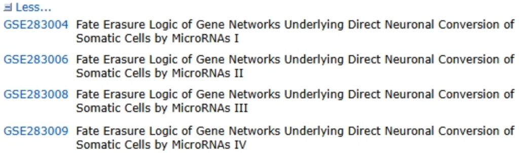 Finally, I would like to introduce the concept of “SubSeries” and “SuperSeries”. In many complex biomedical studies, researchers will perform many RNA-seq experiments. If the dataset is big, it may be a good idea to split data into multiple datasets according to experimental conditions (“SubSeries”), and group them together under a GEO “SuperSeries”. For example, our previous dataset GSE283004 is a “SubSeries” of a SuperSeries GSE283010. This SuperSeries GSE283010 includes metadata of a big research study with 66 biological samples, but itself does not contain any processed data files. Instead, the processed data files in this study are submitted into four Subseries under this SuperSeries: GSE283004, GSE283006, GSE283008 and GSE283009 (Figure 8). Each SubSeries contains data for a separate section of the primary publication. Although in this example, researchers only submitted study-level processed data files, it is possible to submit sample-level processed data files in each SubSeries.